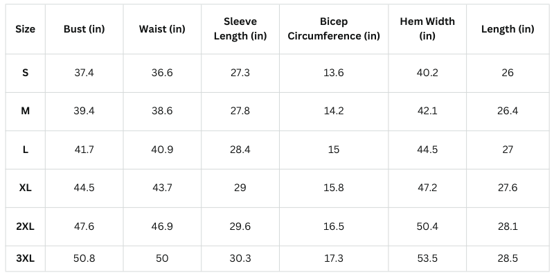 Size Chart (Inches):