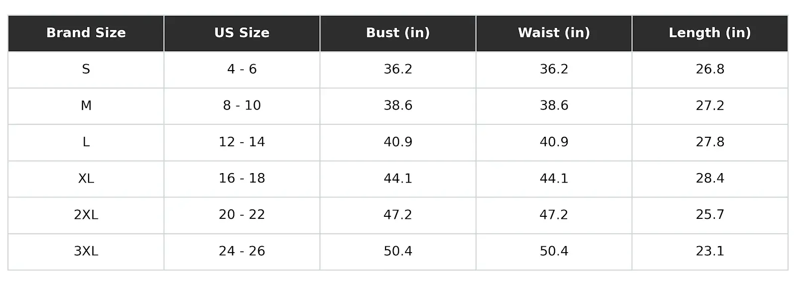 Size Chart (Inches):