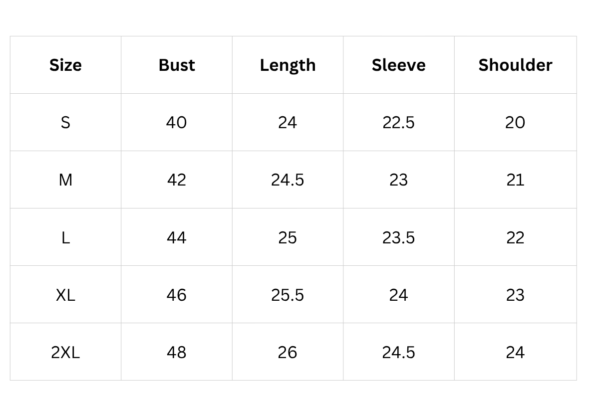 Size Chart (inches):