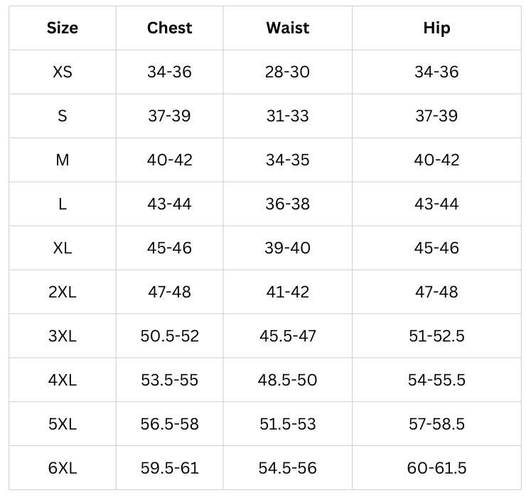 Size Chart (inches):