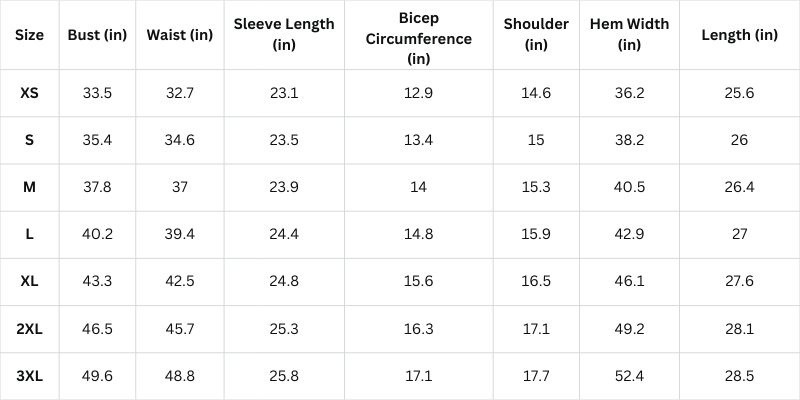 Size Chart (Inches):