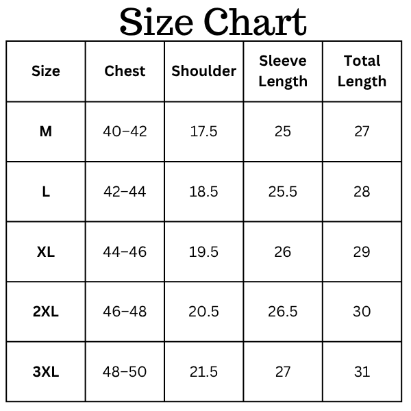 Size Chart (inches):