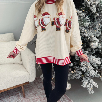 The Santa Stripe Holiday Sweater Ensemble adds a festive touch with its soft knit fabric and charming Santa Claus motif. Highlighted by red and white striped cuffs and hem, this oversized sweater provides a cozy fit, making it great for casual holiday wear. The ribbed texture adds a classic feel, making it a versatile option for Christmas celebrations or comfortable winter days.