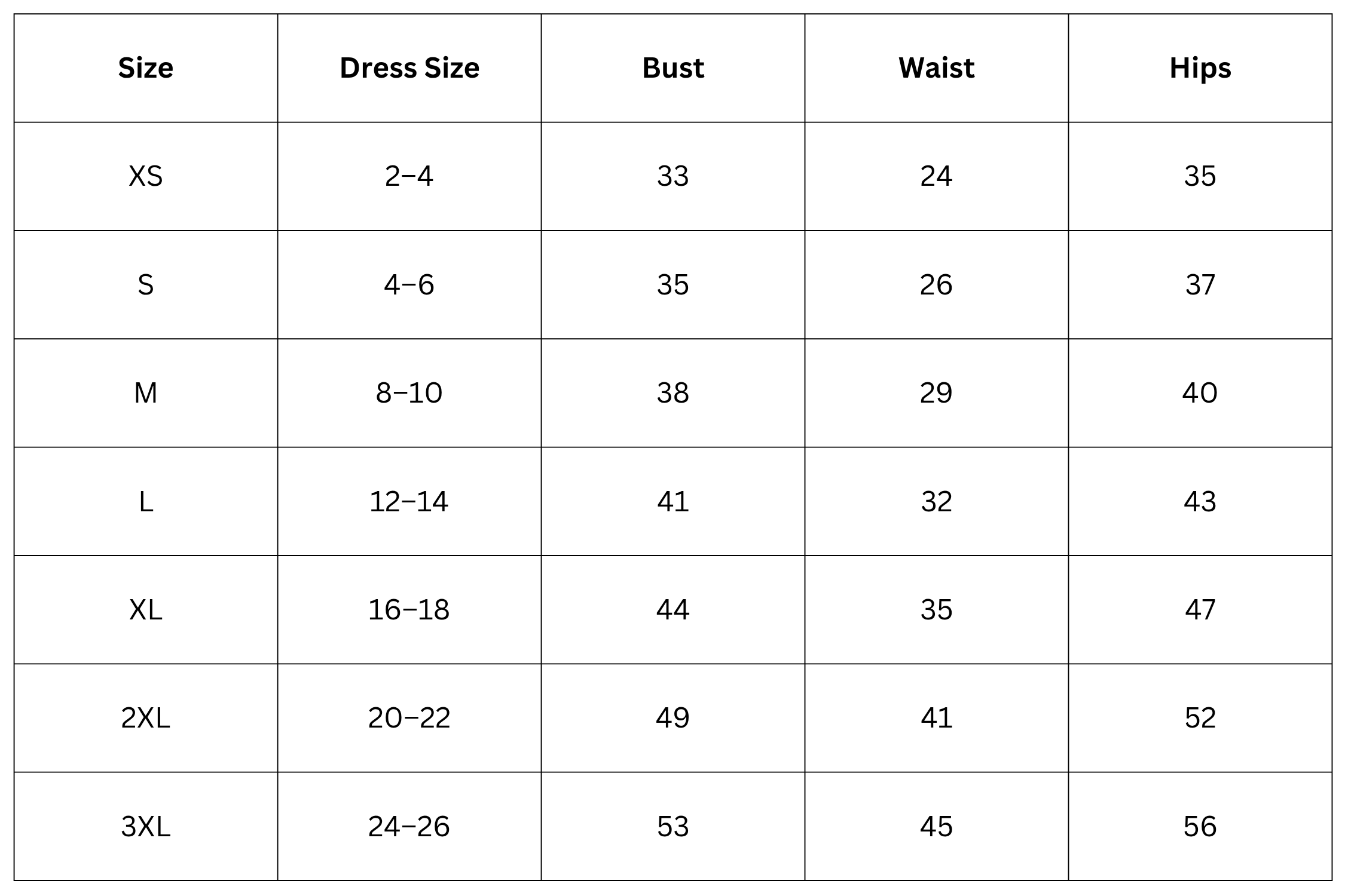 Women Size Chart (Inches):