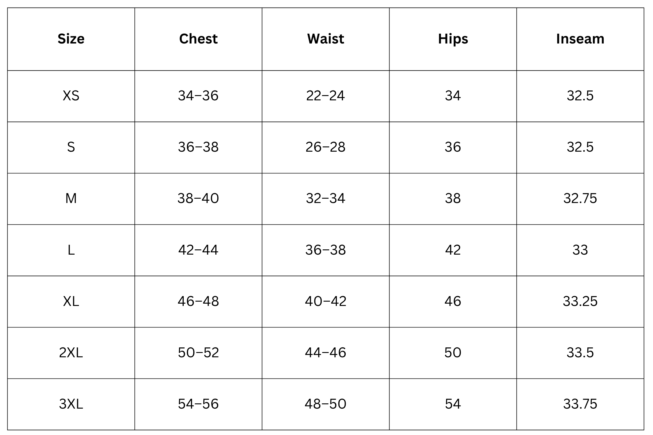 Men Size Chart (Inches):