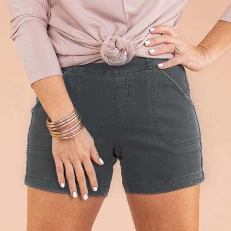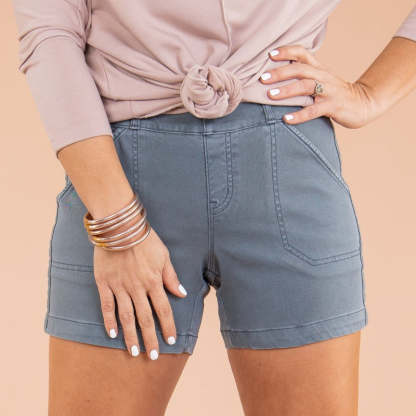 Experience ultimate comfort with these ultra-soft patch pocket shorts, available in 6” and 4” inseam options. Featuring a convenient pull-on design and discreet tummy shaping, these shorts provide a flattering fit all around. It's twill...with a twist!